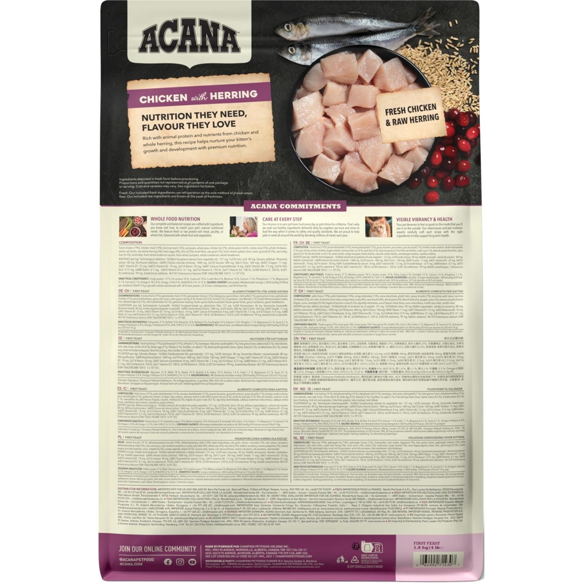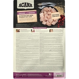 Fersk kylling (19 %), kyllingemel (14 %), sildemel (13 %), havregryn, hele ærter, kyllingefedt (7 %), hele grønne linser, kalkunmel (5 %), hele kikærter, hele røde linser, rå hele sild (4 %), friske æg (4 %), fiskeolie (2 %), linsefibre, rå vagtler (1 %), friske kyllingeindmad (lever, hjerte, kråse) (0,5 %), rå kalkunlever (0,5 %), tørret hjælp, friske hele butternutsquash, friske hele græskar, hele tranebær, hele blåbær.