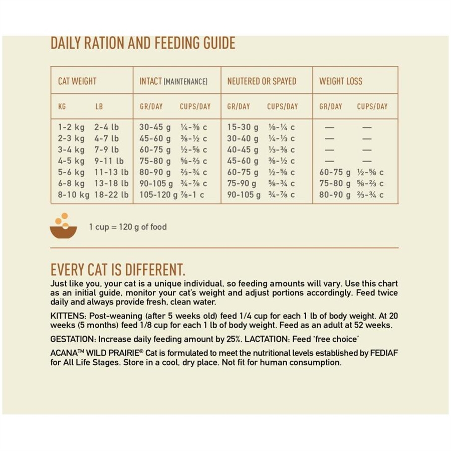 Fersk kylling (11 %), rå kalkun (10 %), fersk kyllingeindmad (lever, hjerte) (9 %), kyllingemel (9 %), kalkunmel (8 %), sildemel (8 %), hele pintobønner, hele ærter, kyllingefedt (5 %), hele røde linser, hele kikærter, hele grønne linser, friske æg (4 %), rå ferskvandssøfisk* (4 %), rå ørred (4 %), rå kalkunlever (2 %), linsefibre, fiskeolie (1 %), tørret kelp, friske hele græskar, friske hele butternutsquash, friske hele gulerødder, friske hele æbler, friske hele pærer, friske hele zucchini, tørret cikorierod, frisk grønkål, frisk spinat, friske majroer, friske rødbeder, hele tranebær, hele blåbær, hele saskatoonbær, gurkemejerod, marietidsel, burrerod, lavendel, althearod, hybenroser. *Varieret blanding af rå tullibee, hvidfisk, gedde og multe.