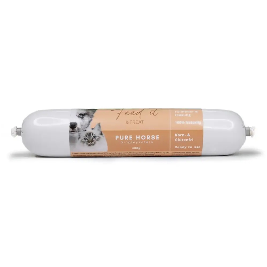 En lækker kødholdig pølse med Hest, som kan anvendes til fuldfoder til både hund og kat.