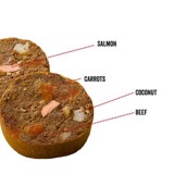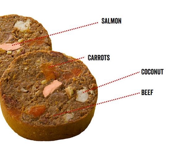 80% laks, okse og indmad (31% laks, 29% oksekød, 15% oksehjerte, 5% okselever), 12,5% gulerod, 2,5% græskar, revet kokosnød, malede græskarkerner, havsalt, æggeskalspulver, spirulina