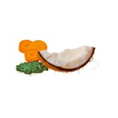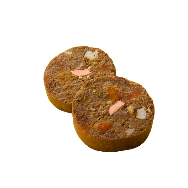 Fuldfoder i skærefast pølse med indhold af frisk laks med gulerod, kokosnød og spirulina