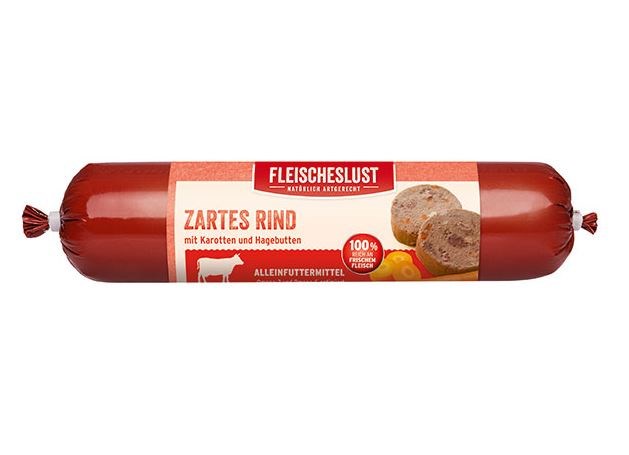 - Pølser fra Fleischeslust, som er fuldfoder til hunde, og der skal ikke tilsættes yderligere.