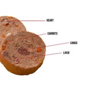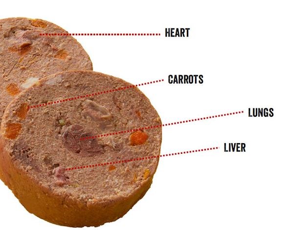 80% okse og indmad (45% oksekød, 15% okselunge, 5% okselever), 10% gulerod, 4% malede græskarkerner, 1,3% hyben pulver, hørfrøolie, havsalt, æggeskalspulver, mineraljord