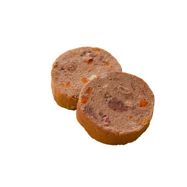 Fuldfoder i skærefast pølse med indhold af okse med gulerod og hyben