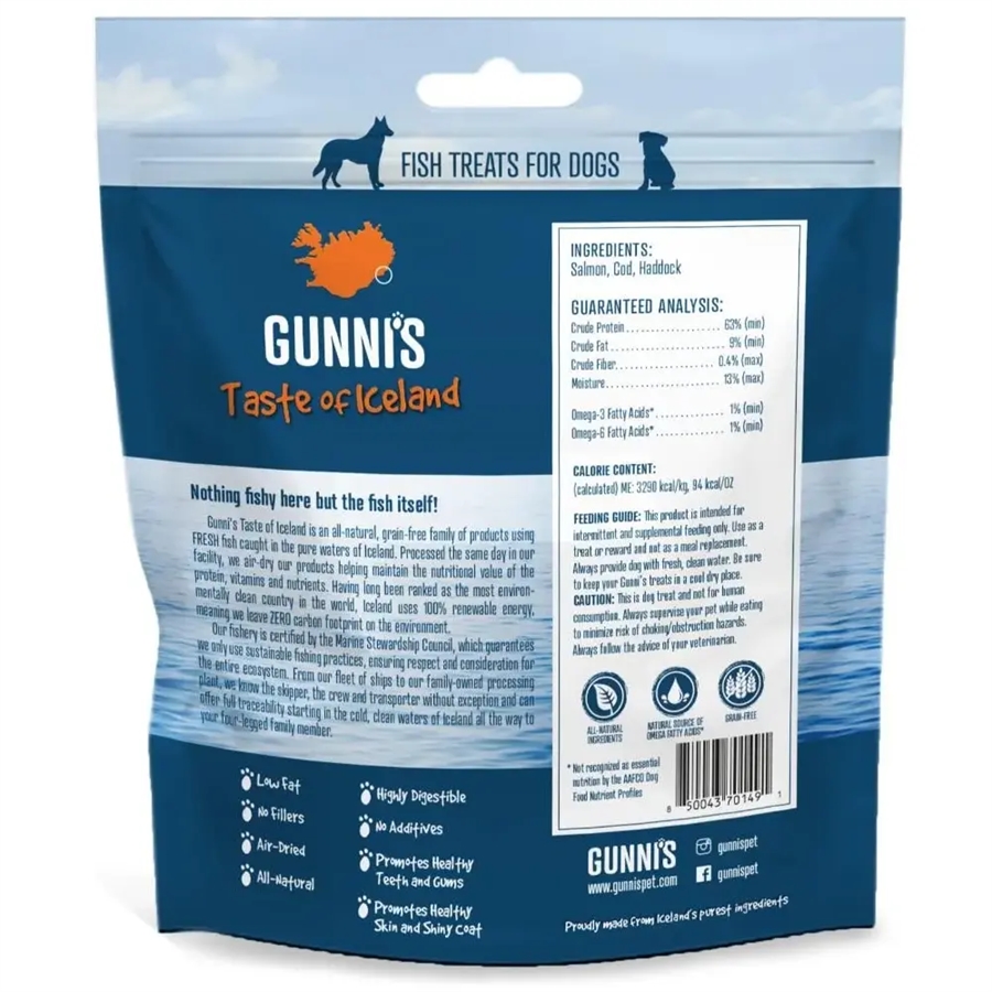 Fiskeriet er certificeret af Marine Stewardship Council, hvilket garanterer, at der kun bruges bæredygtige fiskerimetoder, der sikrer respekt og hensyntagen til hele økosystemet. Gunnis tilbyder fuld sporbarhed hele vejen fra Islands kolde, rene vand til de firbenede familievenner.