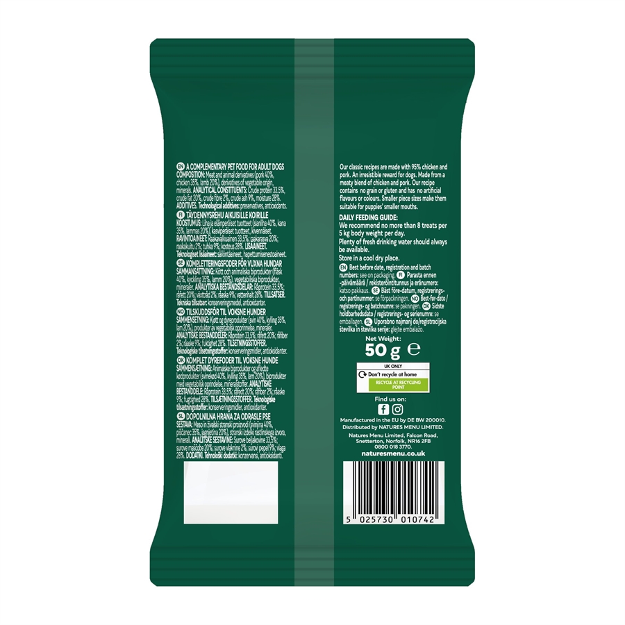Lækre kødfulde og bløde godbidder der kan 'nipses' over i mindre bider, hvis man ønsker. Godbidderne som indeholder 95% kød dufter fantastisk og den skal nok fange din hunds opmærksomhed.