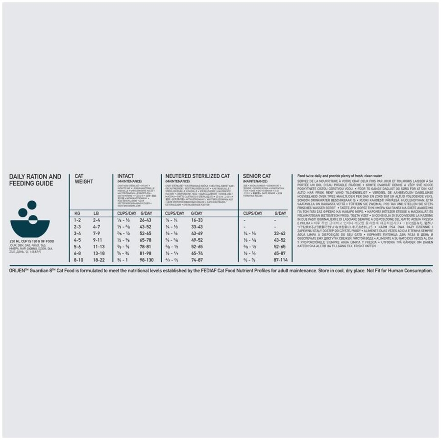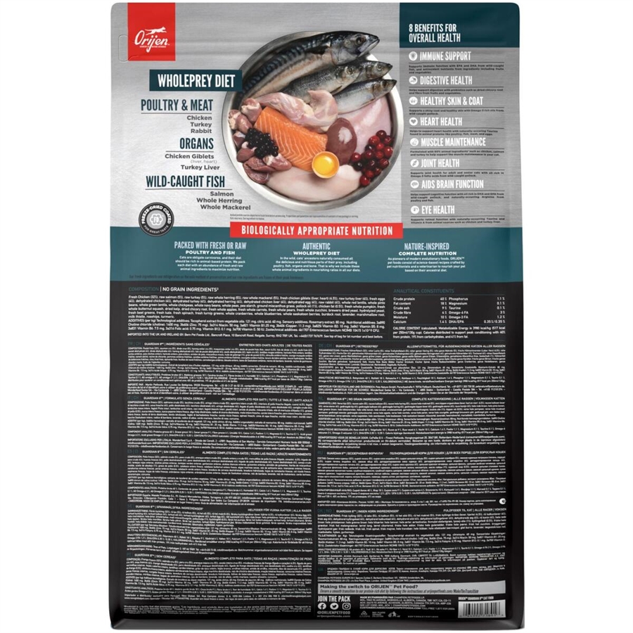 Kylling, laks, kalkun, hele sild, kyllingelever, dehydreret kylling, dehydreret kalkun, dehydreret sardin, dehydreret kyllingelever, dehydreret æg, hele røde linser, hele pintobønner, kalkunindmad (lever, hjerte, krås), æg, kanin, sejolie, hele grønne linser, hele navybønner, hele kikærter, hele ærter, malet miscanthusgræs, naturlig kyllingesmag, kyllingefedt, kyllingehjerter, hele tranebær, cholinchlorid, tørret tang, blandede tocoferoler (konserveringsmiddel), hele græskar, hele butternut squash, collard greens, hele æbler, hele pærer, zinkproteinat, vitamin E supplement, tørret cikorierod, hydrolyseret gær, tørret ølgær, thiaminmononitrat, riboflavin, niacin, calciumpantothenat, pyridoxinhydrochlorid, folinsyre, vitamin B12 supplement, Kobberproteinat, tørret Bacillus coagulans gæringsprodukt, gurkemeje, sarsaparilla rod, althea rod, hyben, enebær, citronsyre (konserveringsmiddel), rosmarinekstrakt.