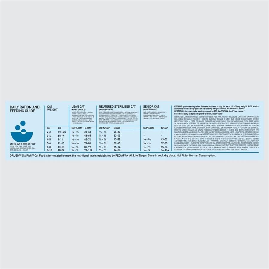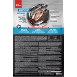 Frisk hel stillehavssardin (26%), frisk hel stillehavskulmule (9%), frisk hel stillehavsmakrel (8%), frisk hel stillehavshellefisk (5%), frisk hel rødfisk (5%), frisk hel søtunge (5%), hel makrel (dehydreret, 5%), hel sild (dehydreret, 5%), hel blåhvilling (dehydreret, 5%), silde-olie (5%), Alaska torsk (dehydreret, 5%), hele røde linser, hele grønne linser, hele grønne ærter, koldpresset solsikkeolie, hel sardin (dehydreret, 1,5%), linsefiber, hele kikærter, hele gule ærter, hele pintobønner, torskelever (Frysetørret), frisk hel græskar, frisk hel mandel-græskar, frisk hel zucchini, frisk hel pastinak, friske hele gulerødder, friske hele Red Delicious æbler, friske hele Bartlett pærer, frisk have-kål, frisk spinat, frisk rødbede, frisk majroe, brun tang, hele tranebær, hele blåbær, hele ellebladet bærmispel, cikorierod, gurkemeje, mælkebøtte, glat burre, lavendel, læge-stokrose, hyben.