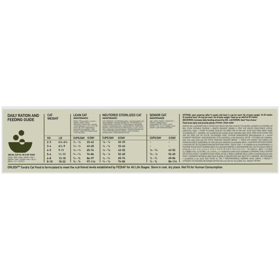 Rå and (8%), rå fjeldørred (8%), rå stålørred (7%), rå hel pilchard (6%), rå vildtkød (6%), rå svinelever (5%), rå andelever (4%), friske æg (4%), dehydreret hvidfisk (4%), dehydreret blåhvilling (4%), sildfedt (4%), sildfedt (4%) dehydreret lam (4%), dehydreret fårekød (4%), hele grønne linser, hele kikærter, hele ærter, rå lam (3%), rå ged (3%), rå lammelever (3%), linsefibre, ærtestivelse, hele røde linser, hele pinto bønner, dehydreret and (1%), dehydreret mackerelolie (1%), lambkidneyolie (1%) (0,5%), rå lammekalk (0,5%), tørret tang, frisk hele græskar, frisk hel squash, frisk hele courgette, friske hele gulerødder, friske hele æbler, friske hele pærer, tørret cikorierod, frisk grønkål, frisk spinat, frisk rødbedegrønt, friske majroer, søde tranebær, helmælk, hele tranebær, denne burrerod, lavendel, skumfidusrod, hyben
