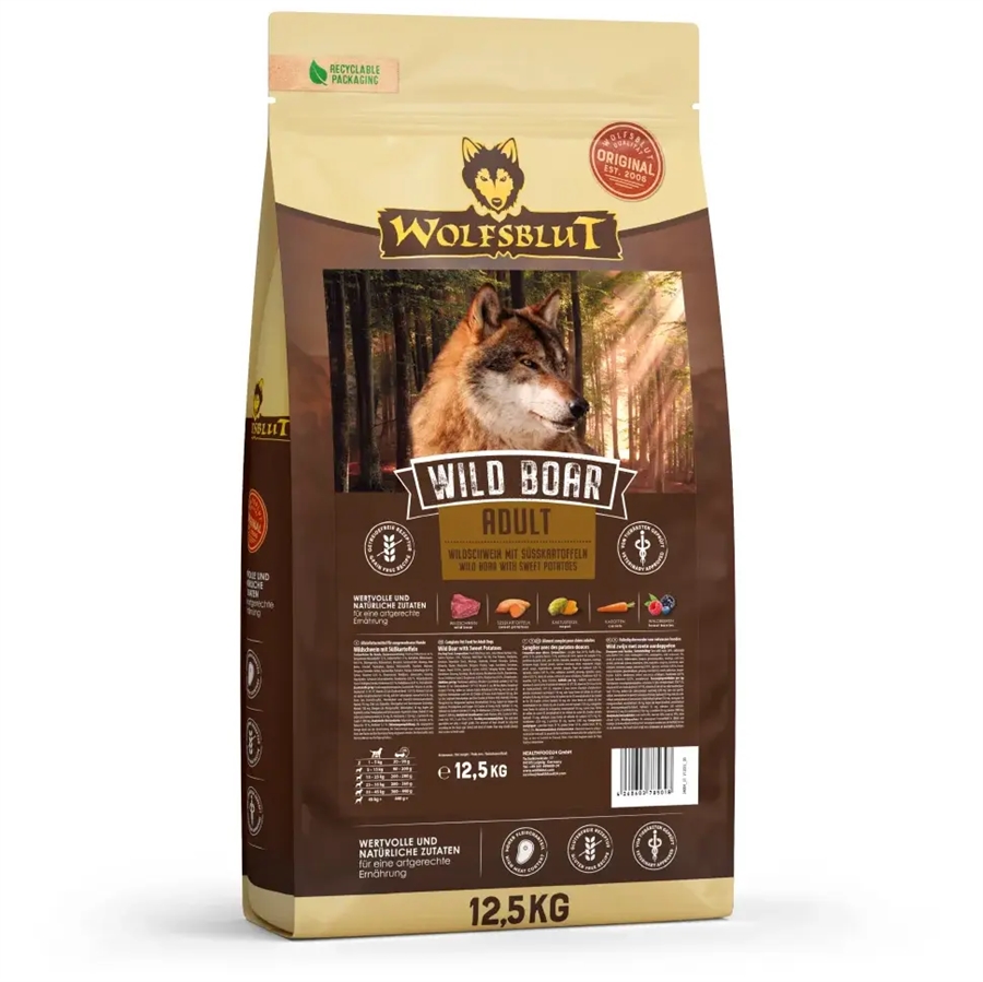 Frisk vildsvin 26%, tørret vandbøffel 15%, søde kartofler 13%, kartofler, vildsvinefedt 9%, ærteprotein, kikærter, bananer, grøntsagsbouillon, moringa, rødbeder, fennikel, pastinakker, quinoa, mineraler, timian, merian, oregano, persille 0,1%, salvie, jordskokker, tomater, papaya, figenkaktus 0,05%, spinat, gulerødder 0,05%, brændenælde, tjørn, mælkebøtte, ginseng, hyben, solbær, brombær 0,02%, hyldebær, yucca schidigera-ekstrakt, hindbær 0,01%, blåbær 0,01%, aroniabær.